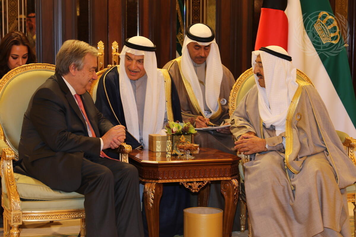Secretary-General António Guterres (left) meets with Sheikh Sabah Al-Ahmad Al-Jaber Al-Sabah (right), Amir of the State of Kuwait, during his visit to the country to participate in the opening session of the Kuwait International Conference for the Reconstruction of Iraq.
