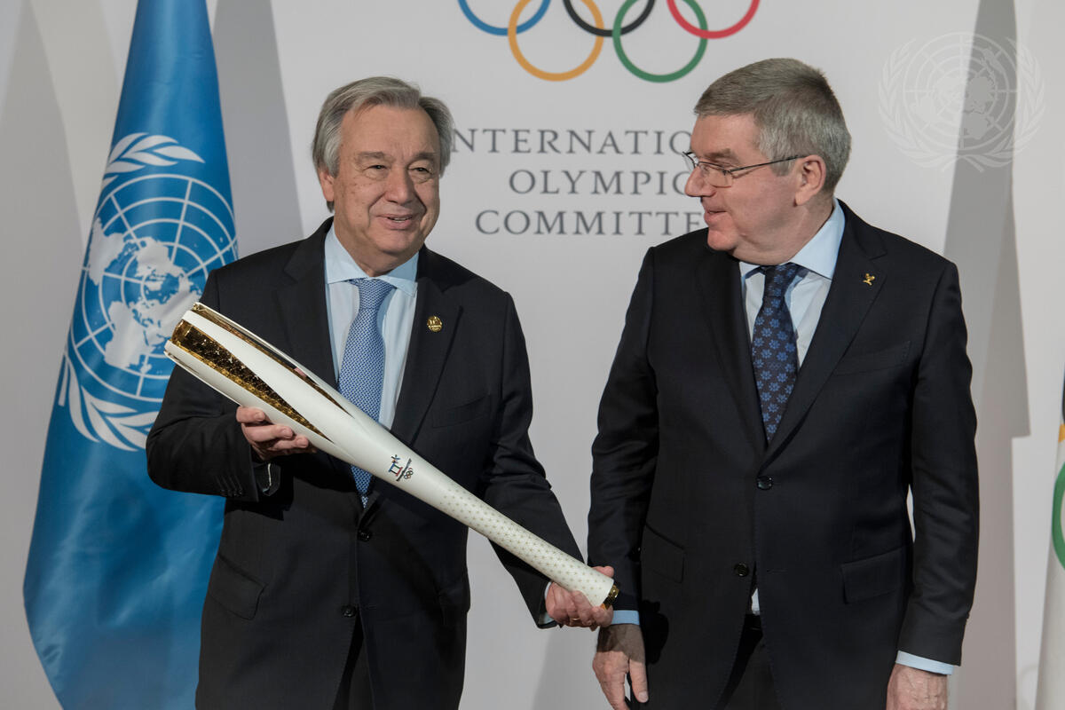 Thomas Bach (right), President of the International Olympic Committee (IOC), gifts an Olympic torch to Secretary-General António Guterres at the IOC office in Pyeongchang.