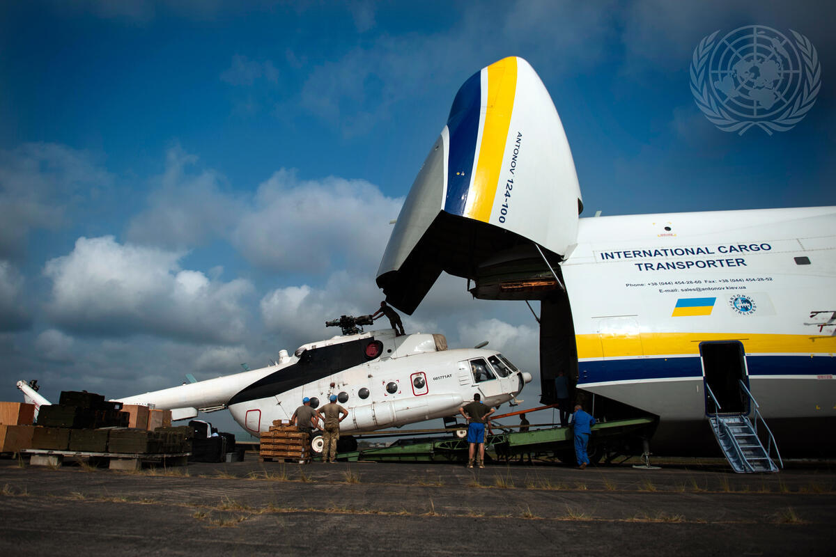 Members of the Ukrainian Aviation Unit serving with UNMIL load a helicopter into an Antonov cargo plane at Roberts International Airport, one of the last three helicopters being flown back to their home country. More than eighty Ukrainian peacekeepers have already left the mission; twenty-five will remain for two weeks more to finalise the contingent withdrawal.