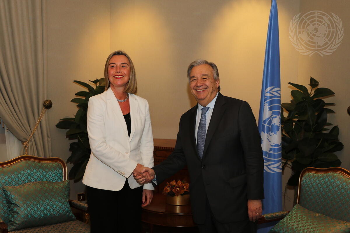 Secretary-General António Guterres (right) meets with Federica Mogherini, High Representative of the European Union for Foreign Affairs and Security Policy,