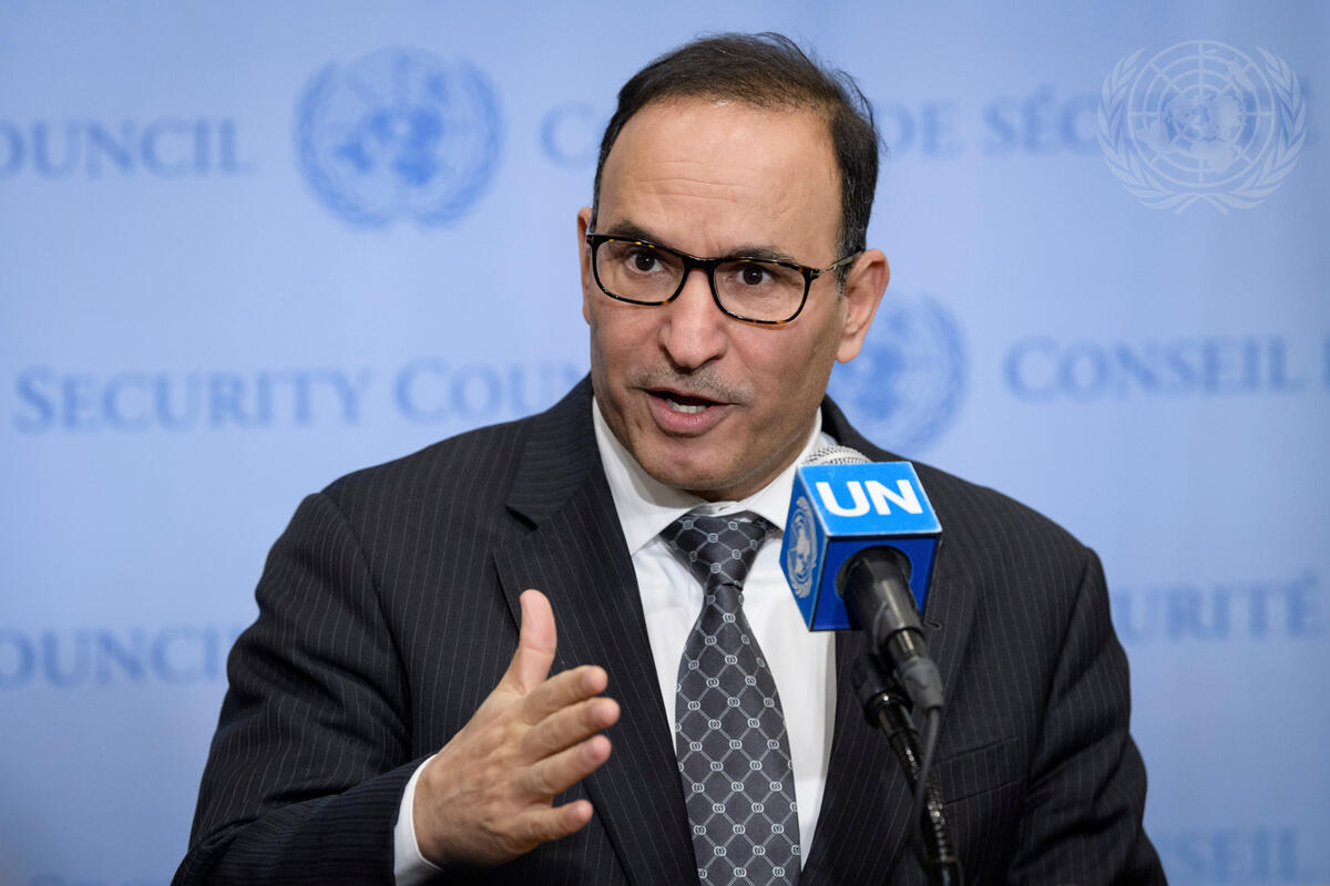 Mansour Al-Otaibi, Permanent Representative of the State of Kuwait to the United Nations and President of the Security Council for the month of February, briefs press following consultations in the Security Council.