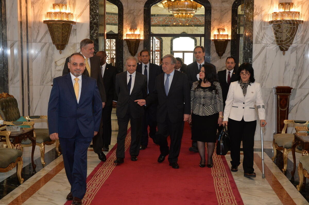 Secretary-General António Guterres (centre) during his visit to Iraq. Pictured with him: Mohamed Ali Alhakim (centre left), Permanent Representative of Iraq to the UN; Ján Kubiš (second from left), Special Representative of the Secretary-General and Head of the United Nations Assistance Mission for Iraq (UNAMI).