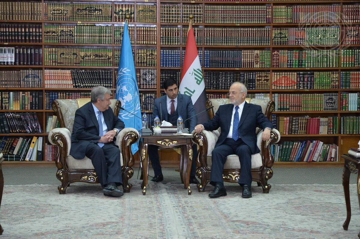 Secretary-General António Guterres (left) meets with Ibrahim Al-Jaafari (right), Minister for Foreign Affairs of Iraq, in Baghdad.