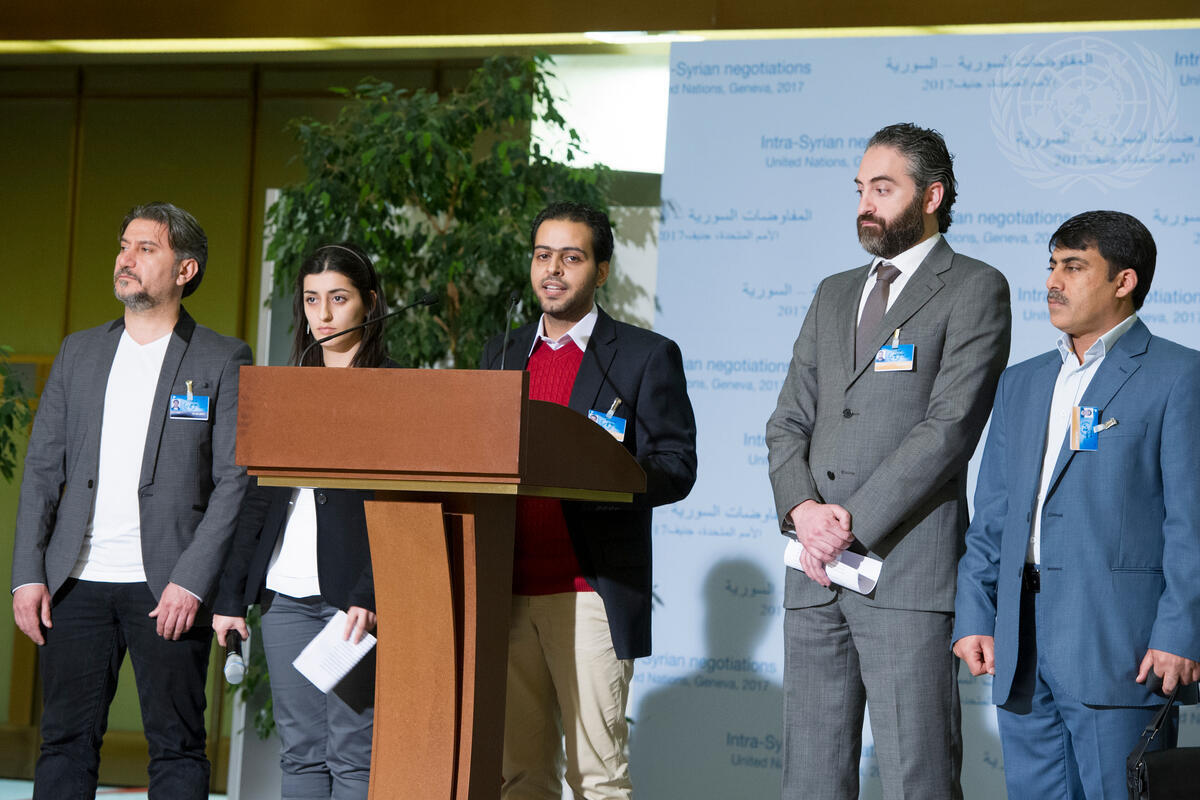 Muhannad Dleikan (centre), representative of the Moscow Group of the Syrian opposition, speaks to journalists following a meeting of his delegation with Staffan de Mistura, UN Special Envoy for Syria, in the latest round of the intra-Syria talks in Geneva.
