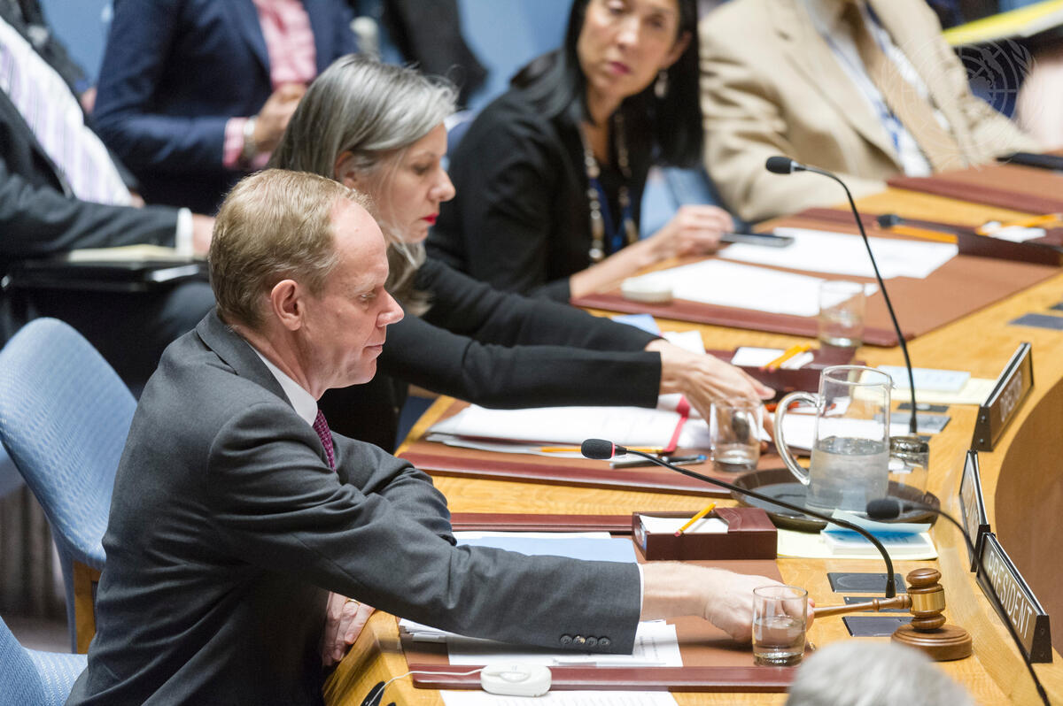 Matthew Rycroft, Permanent Representative of the United Kingdom to the UN and President of the Security Council for March, chairs the meeting.