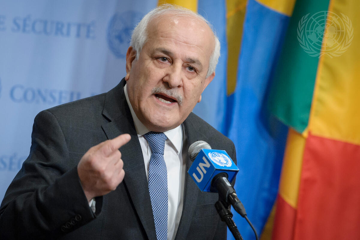 Riyad H. Mansour, Permanent Observer of the State of Palestine to the UN, speaks to journalists, following a Security Council meeting on the Middle East situation, including the Palestinian question.