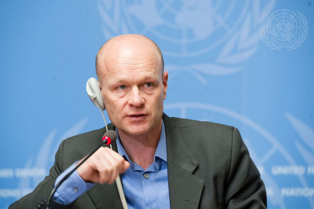 Jens Laerke, Spokesperson for the Office for the Coordination of Humanitarian Affairs (OCHA), briefs the press at Palais des Nations in Geneva.