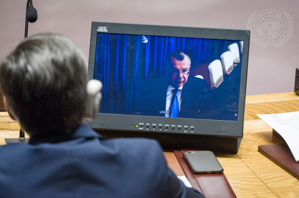 Yury Fedotov (shown on screen), Executive Director of the UN Office on Drugs and Crime (UNODC), addresses the Council via video teleconference.