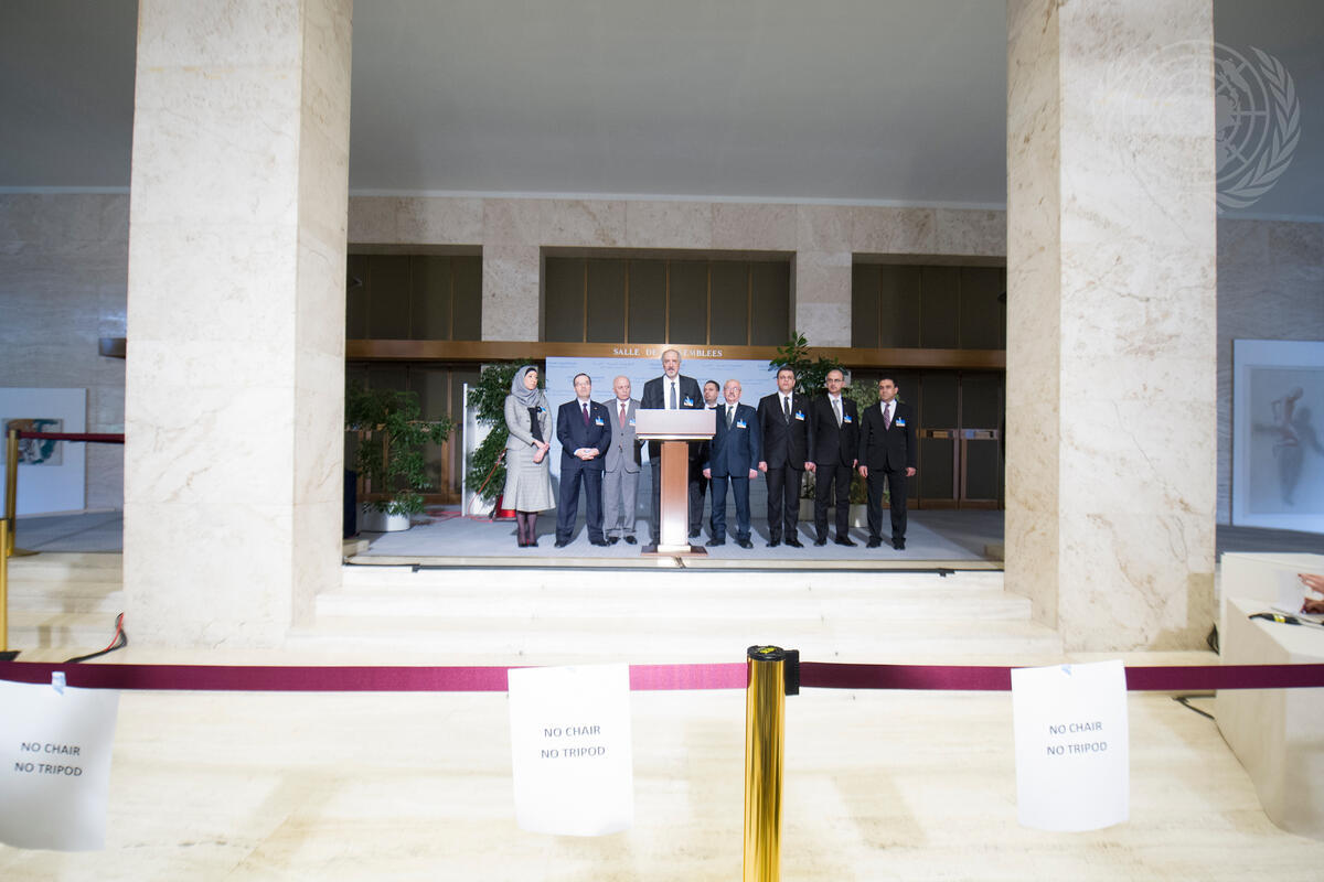 Bashar Al Jaafari (at lectern), Permanent Representative of the Syrian Arab Republic to the United Nations, New York, and Head of the Syrian Government delegation, speaks to journalists following his delegation's meeting with Staffan de Mistura, UN Special Envoy for Syria, in the latest round of the intra-Syria talks in Geneva.