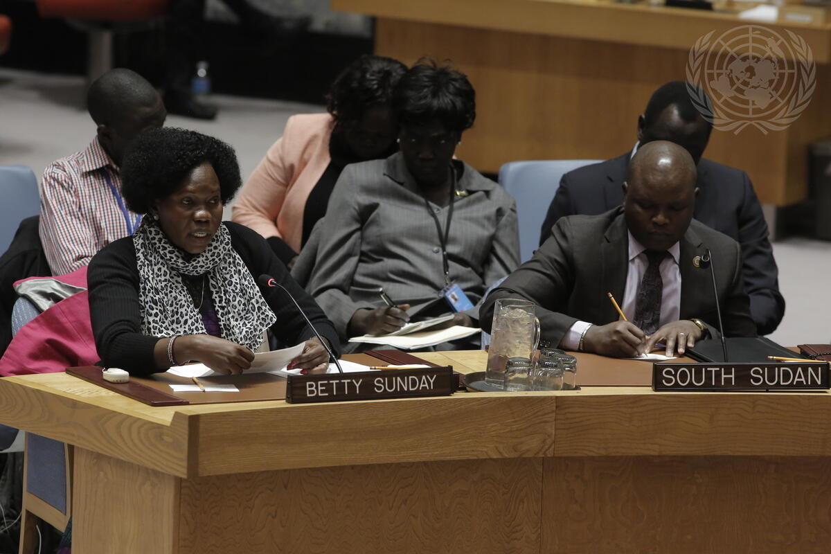 Betty Sunday (left), Coordinator for the Women’s Forum on Peace and Political Processes in South Sudan, addresses the Security Council meeting on the situation in that country. At right is Joseph Moum Majak Ngor Malok, Chargé d'affaires at the Permanent Mission of the Republic of South Sudan to the UN.