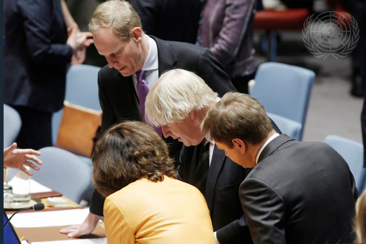 Boris Johnson (second from right), Secretary of State for Foreign and Commonwealth Affairs of the United Kingdom and President of the Security Council for March, consults with members of his delegation, including Matthew Rycroft (third from right), Permanent Representative to the UN, at the Council meeting.