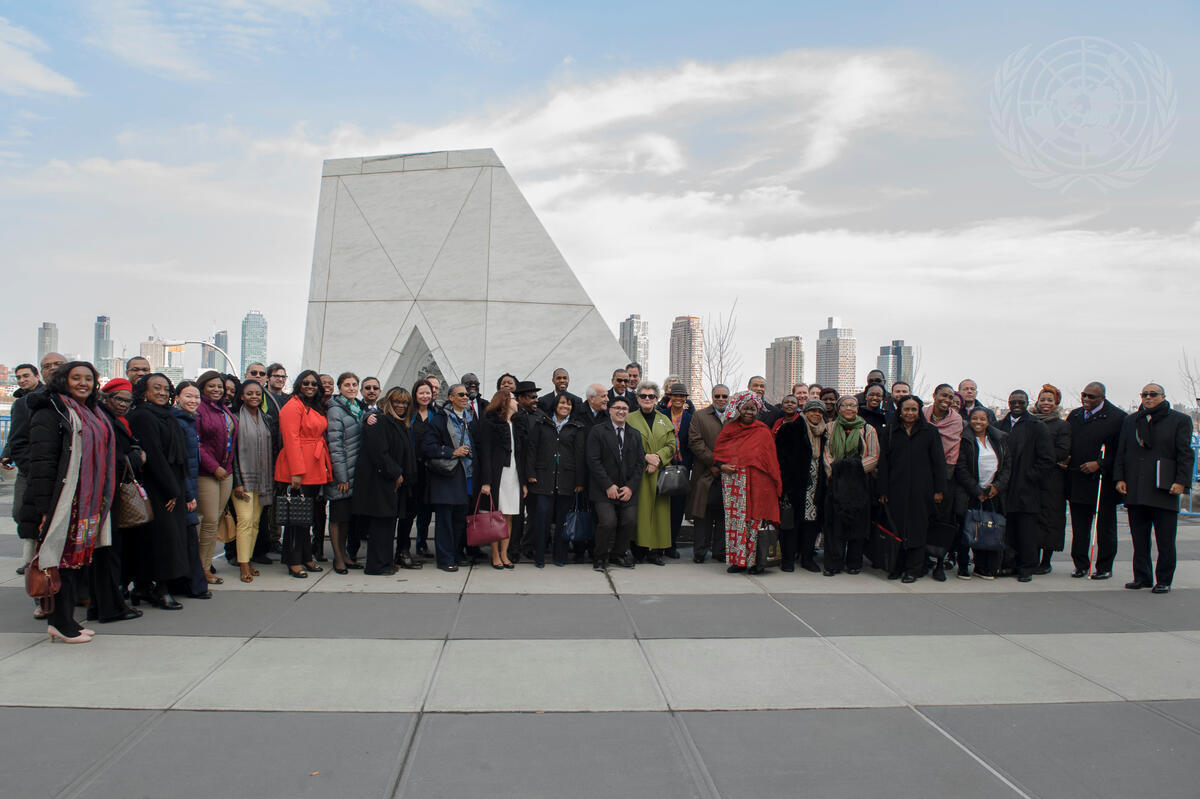 Delegates gather near the ""Ark of Return"", the Permanent Memorial to honour the victims of slavery and the transatlantic slave trade, for the inauguration of a memorial plaque on the Ark. The event was organized by the Permanent Mission of Jamaica to the UN, on the occasion of the International Day of Remembrance of the Victims of Slavery and the Transatlantic Slave Trade (25 March).