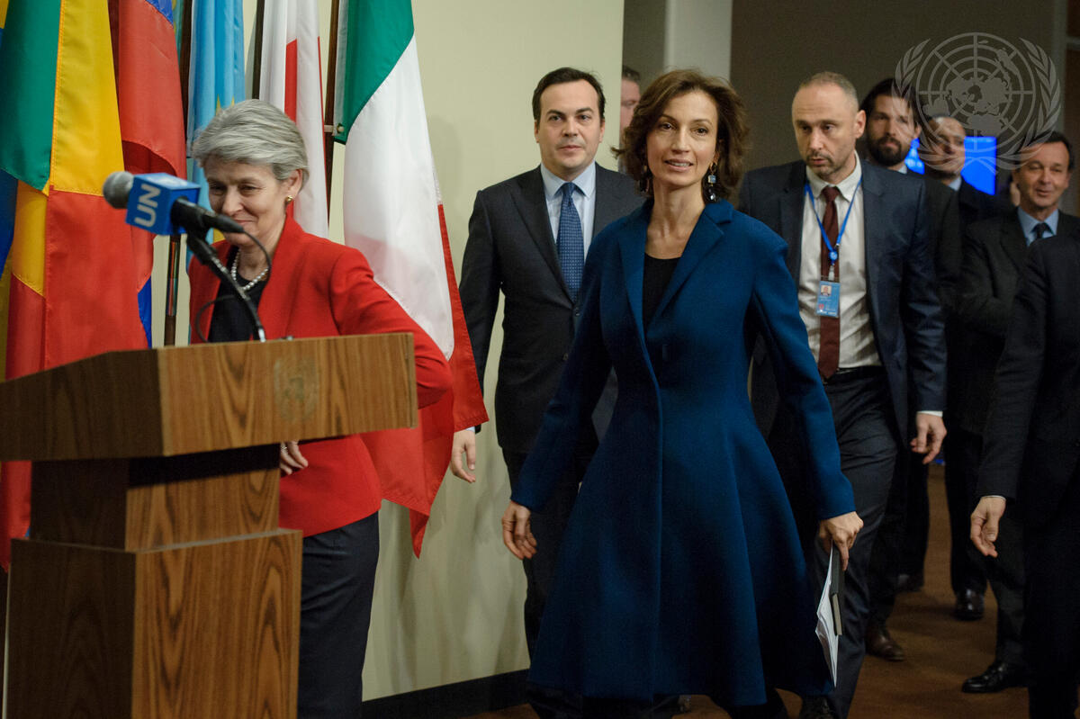 Irina Bokova (left), Director-General of the United Nations Educational, Scientific and Cultural Organization (UNESCO), approaches the lectern to address journalists on the Security Council resolution on the protection of cultural heritage in armed conflicts. Joining her in speaking to reporters were (from left): Vincenzo Amendola, Deputy Minister for Foreign Affairs and International Cooperation of Italy; and Audrey Azoulay, Minister for Culture and Communication of France.