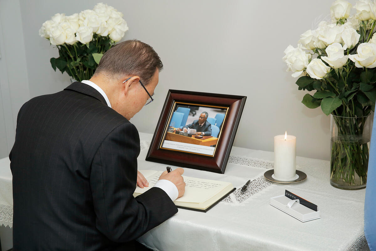 Secretary-General Ban Ki-moon signs a book of condolences at the Permanent Mission of Eritrea to the United Nations, on the recent passing of Girma Asmerom Tesfay, the country’s Permanent Representative to the UN.