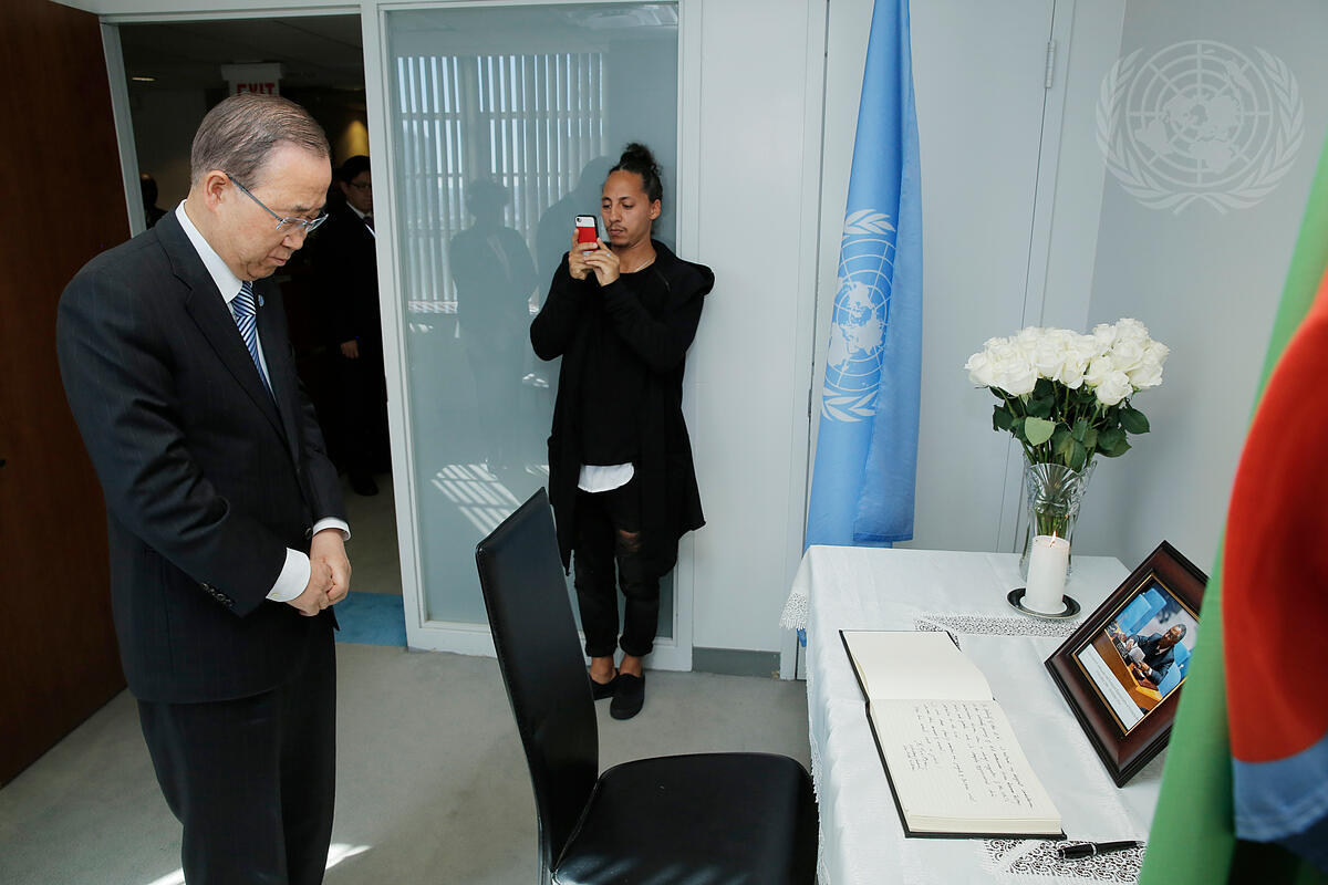 Secretary-General Ban Ki-moon (left) signs a book of condolences at the Permanent Mission of Eritrea to the United Nations, on the recent passing of Girma Asmerom Tesfay, the country’s Permanent Representative to the UN.
