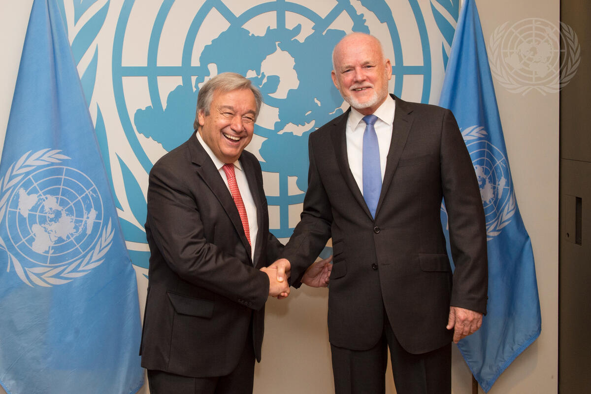 Peter Thomson (right), President of seventy-first session of the General Assembly, meets with António Guterres, Secretary-General-designate. The General Assembly appointed Mr. Guterres by acclamation, to serve as the next Secretary-General of the United Nations.