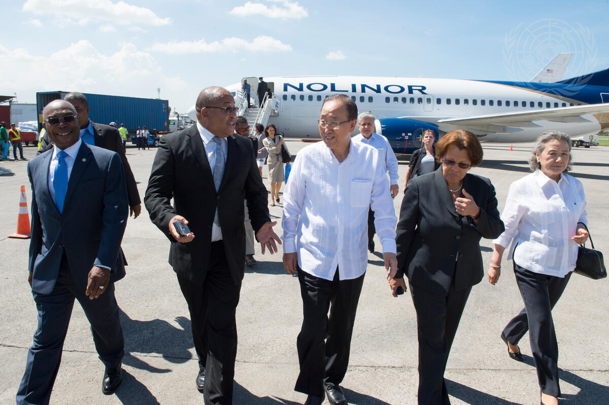 Secretary-General Ban Ki-moon (third from left) arrives in Toussaint L’Ouverture Airport, Port au Prince, Haiti, to meet with communities affected by hurricane Matthew, government officials and humanitarians working in the country. He is received by Enex Jean-Charles (left), Prime Minister of Haiti, Pierrot Délienne(second from left), Minister for Foreign Affairs of Haiti, and Sandra Honoré (second from right), Special Representative and Head of the United Nations Stabilization Mission in Haiti (MINUSTAH).