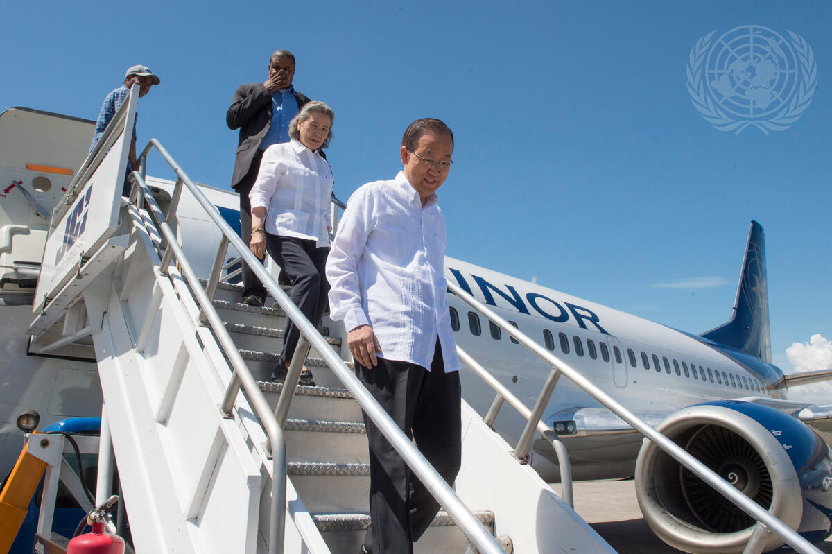 Secretary-General Ban Ki-moon (center) and his wife, Yoo Soon-taek, arrive in Toussaint L’Ouverture Airport, Port au Prince (PAP), Haiti, to meet with communities affected by Hurricane Matthew, Government officials and humanitarians working in the country.