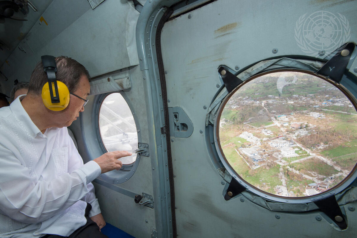 Secretary-General Ban Ki-moon travels to Les Cayes by helicopter overflying Camp Perrin, which was severely damaged by Hurricane Matthew in Haiti. The visit to Les Cayes was part of his trip to meet with communities, Government officials, and humanitarians working in the country.