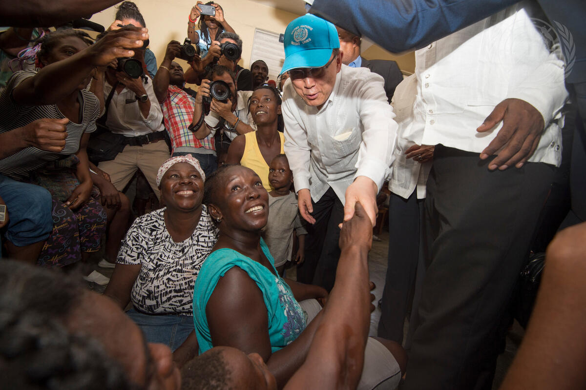 Secretary-General Ban Ki-moon (center) visits a temporary shelter for victims of Hurricane Matthew in High School Philippe Guerrier in Les Cayes, Haiti, during a trip to meet with communities, Government officials, and humanitarians working in the country.