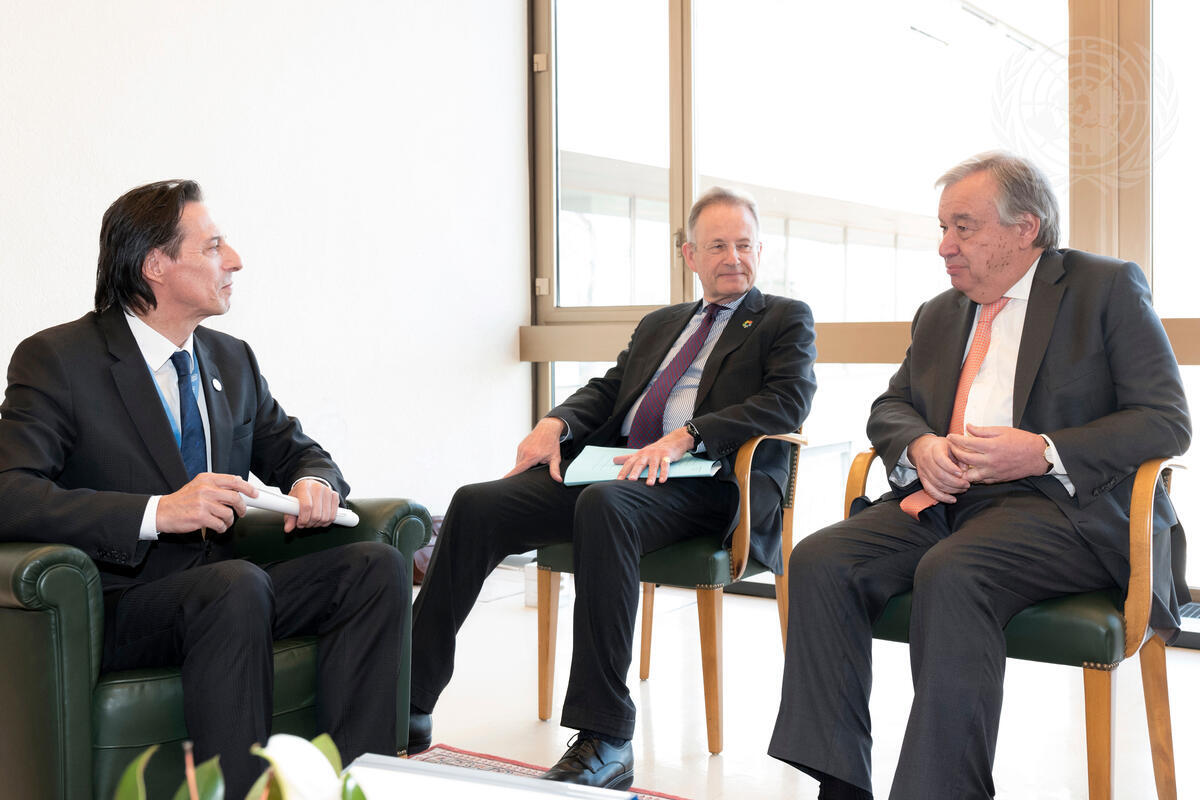 Secretary-General António Guterres (right) meets with Vojislav Šuc (left), Permanent Representative of Slovenia to the United Nations Office at Geneva (UNOG) and President of the thirty-seventh session of the Human Rights Council, on the sidelines of the session's opening. Michael Møller, Director-General of the United Nations Office at Geneva (UNOG), attended the meeting.