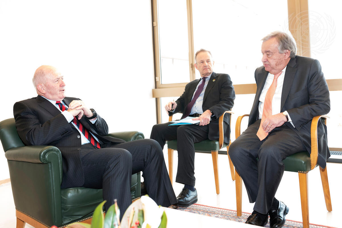 Secretary-General António Guterres (right) meets with Peter Cosgrove (left), Governor-General of the Commonwealth of Australia, on the sidelines of the opening of the thirty-seventh session of the Human Rights Council. Michael Møller, Director-General of the United Nations Office at Geneva (UNOG) attended the meeting.