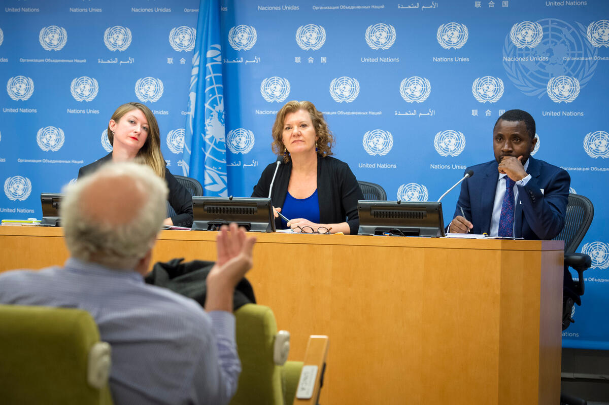 Dragica Mikavica (left), Advocacy Officer at Watchlist on Children and Armed Conflict, Jo Becker (centre), Advocacy Director of the Children's Rights Division of Human Rights Watch, and Bukeni Waruzi, Executive Director of Watchlist on Children and Armed Conflict, at the press conference on the design and implementation of Watchlist's advocacy, strategies, and policy note of the Secretary-General's 2018 Annual Report on Children and Armed Conflict.