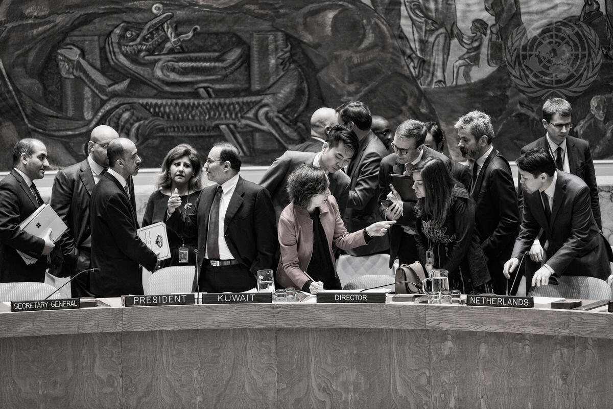 Prior to the meeting Security Council delegations speak with the Director of Security Council Affairs.