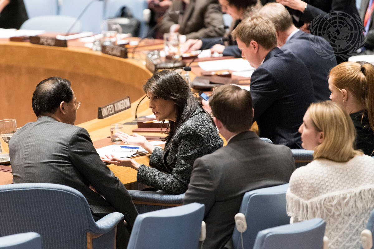 Nikki R Haley, Permanent Representative of the United States to the United Nations, speak with Ma Zhaoxu, Permanent Representative of China to the United Nations.