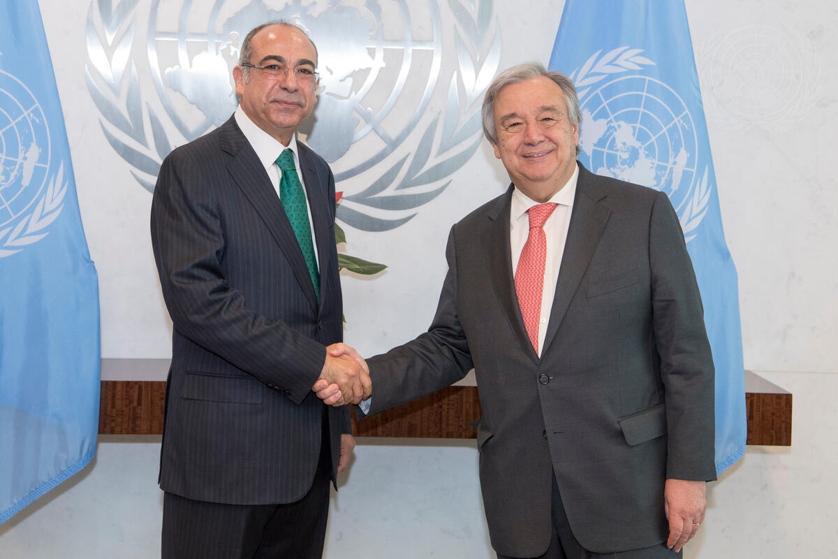 Mohamed Fathi Ahmed Edrees (left), new Permanent Representative of the Arab Republic of Egypt, presents his credentials to Secretary-General António Guterres.