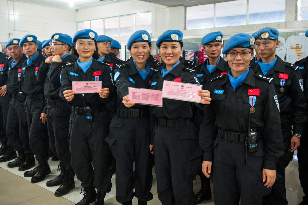 Members of the Chinese Formed Police Unit (FPU) deployed with UNMIL wait to board a plane at Roberts International Airport.