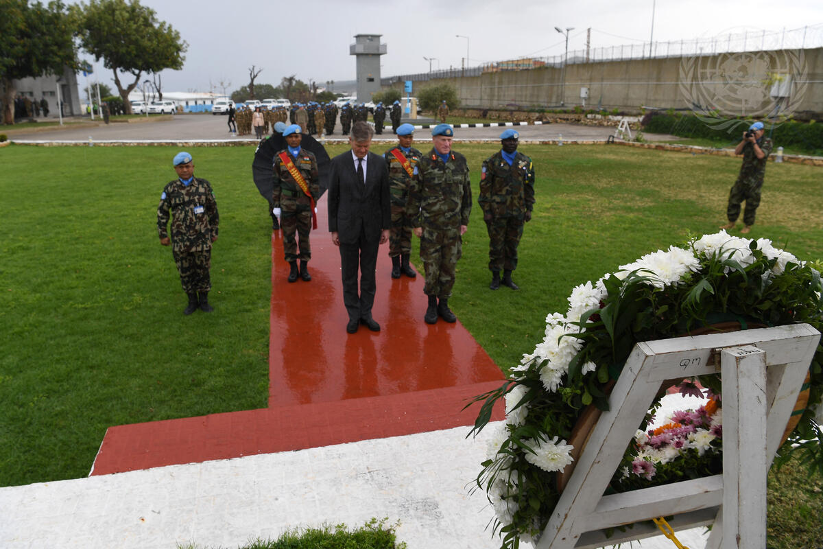 Jean-Pierre Lacroix (centre left), Under-Secretary-General for Peacekeeping Operations, and Major General Michael Beary (centre), Head of Mission and Force Commander of the United Nations Interim Force in Lebanon (UNIFIL), participate in a wreath-laying ceremony at the UNIFIL cenotaph in memory of fallen peacekeepers.