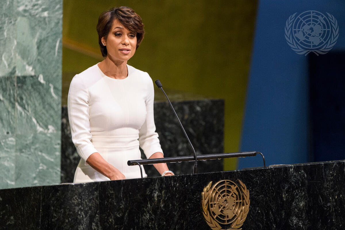 Sade Baderinwa, anchor for WABC-TV in New York, makes remarks during the observance of International Women’s Day at UN headquarters, under the theme ""Time Is Now: Rural and urban activists transforming women’s lives"".