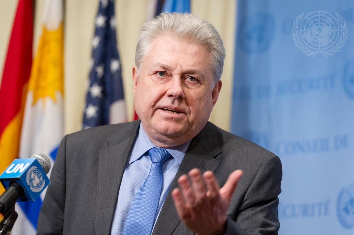 Volodymyr Yelchenko, Permanent Representative of Ukraine to the UN and President of the Security Council for February, speaks to journalists following closed Council consultations on the United Nations Interim Administration Mission in Kosovo (UNMIK).