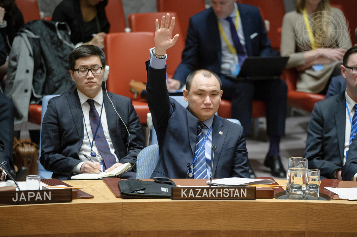 The representative of the Republic of Kazakhstan signals his country’s abstention in the vote.
