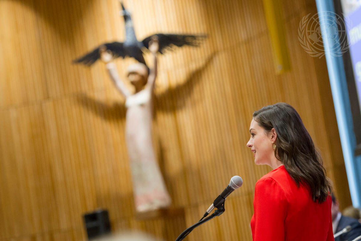 Anne Hathaway, UN Women global Goodwill Ambassador, addresses the event.