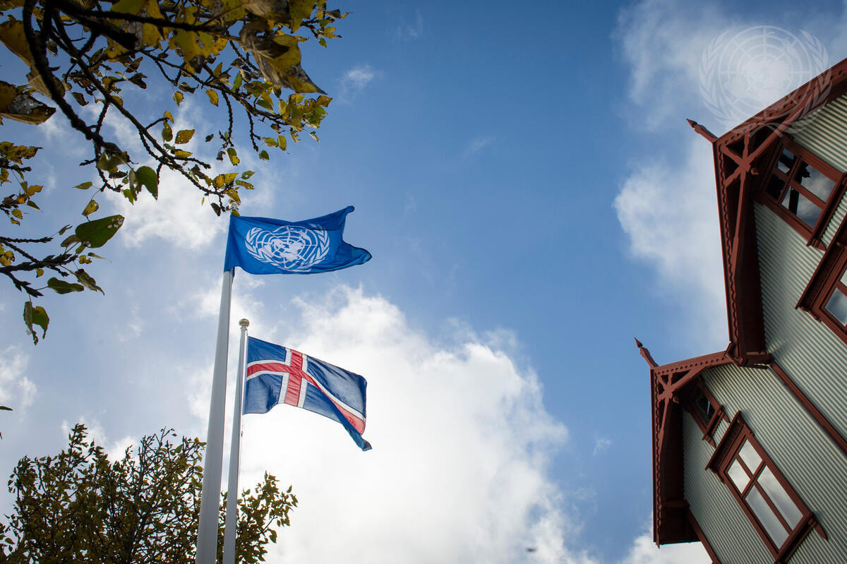 A view of the flags of the United Nations and Iceland, flown outside the Government Guest House during Secretary-General Ban Ki-moon's meeting with Lilja Alfreðsdóttir, Minister of Foreign Affairs of Iceland.