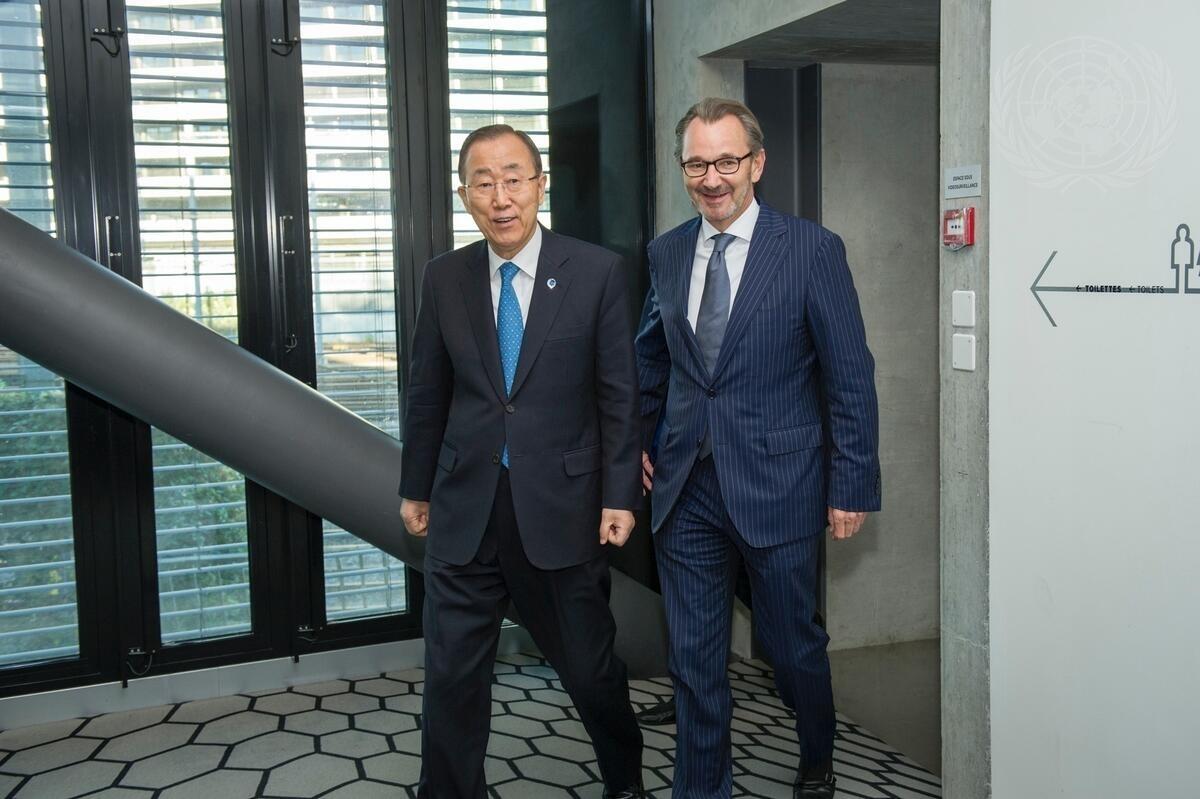 Secretary-General Ban Ki-moon (left) arrives at the Graduate Institute of International and Development Studies (HEID) in Geneva, prior to addressing students and faculty.