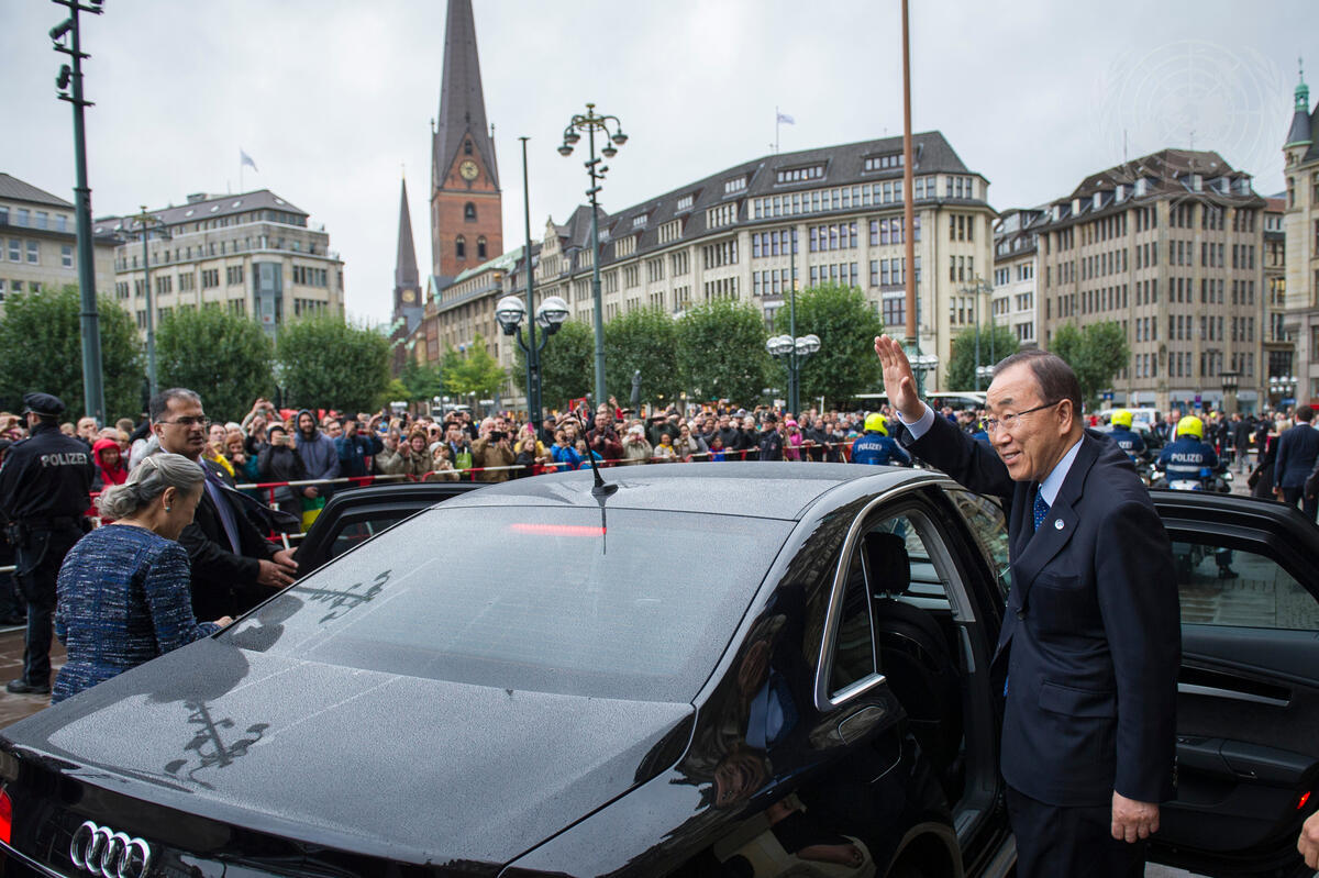 Secretary-General Ban Ki-moon (right) departs from Hamburg City Hall.