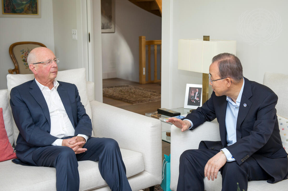 Secretary-General Ban Ki-moon (right) meets with Klaus Schwab, Founder and Executive Chairman of the World Economic Forum (WEF).