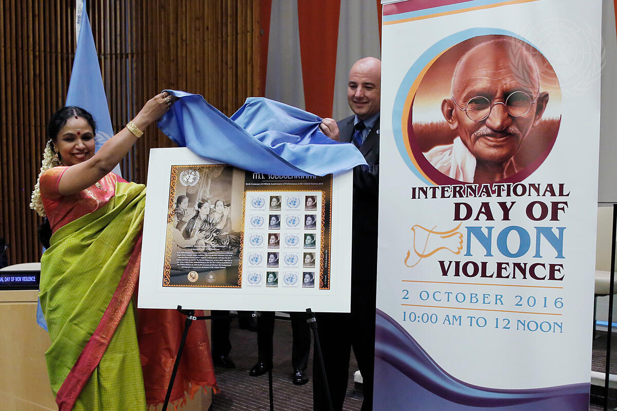 At the special event marking the International Day of Non-Violence, organized by the Permanent Mission of India to the United Nations, Sudha Ragunathan, musician, and Stephen Cutts, Assistant Secretary-General for the Office of Central Support Services, unveil the commemorative stamp of M.S. Subbulakshmi, Indian music legend, on the 50th anniversary of her performance at the UN in 1966. The Day of Non-Violence is observed on 2 October, the birthday of Mahatma Gandhi, leader of the Indian independence movement and pioneer of the non-violence philosophy, as an occasion to disseminate the message of non-violence.