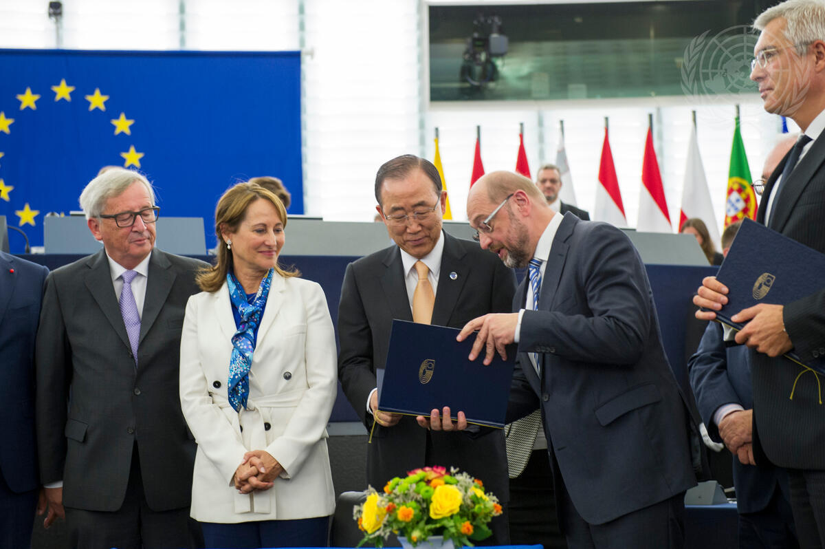 Secretary-General Ban Ki-moon (third from left), witnesses the signing of a symbolic document: an internal EU transmission from the European Parliament to the European Council regarding the outcome of the Parliamentary vote on the Paris Agreement. In the photo, from left to right: Jean-Claude Juncker,