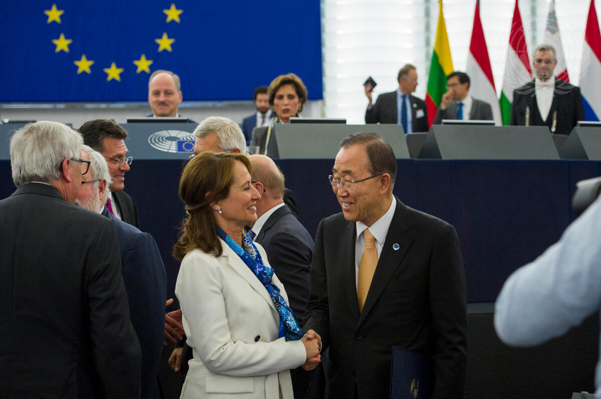 At the European Parliament, where he witnessed the signing of a symbolic document on the outcome of the Parliamentary vote on the Paris Agreement, Secretary-General Ban Ki-moon (right), greets Ségolène Royal (left), President of COP21 and Minister of the Environment, Energy and Marine Affairs of France.