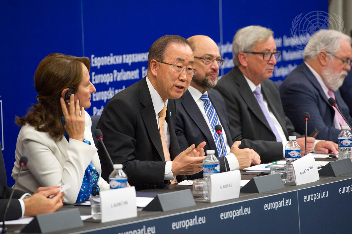 Secretary-General Ban Ki-moon addressed a session of the European Parliament during which parliamentarians voiced their support for the speedy ratification of the Paris Agreement on climate change. Immediately afterwards, the Secretary-General (second from left) takes part in a press conference alongside (fron left): Ségolène Royal, President of COP21; Martin Schulz, President of the European Parliament; and Jean-Claude Juncker, President of the European Commission.