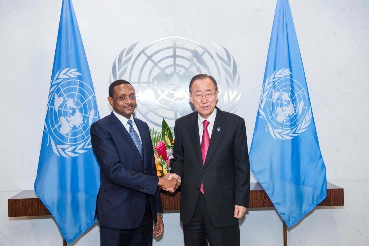 Mahamat Zene Cherif (left), Permanent Representative of the Republic of Chad to the United Nations, pays a farewell call on Secretary-General Ban Ki-moon.