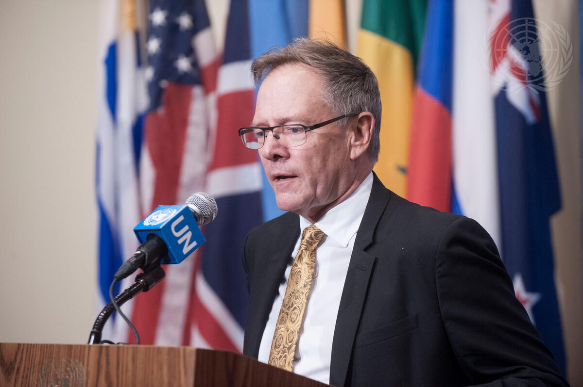 Gerard Jacobus van Bohemen, Permanent Representative of New Zealand to the UN and President of the Security Council for September, speaks to journalists, following a Council consultations on the humanitarian situation in Syria.