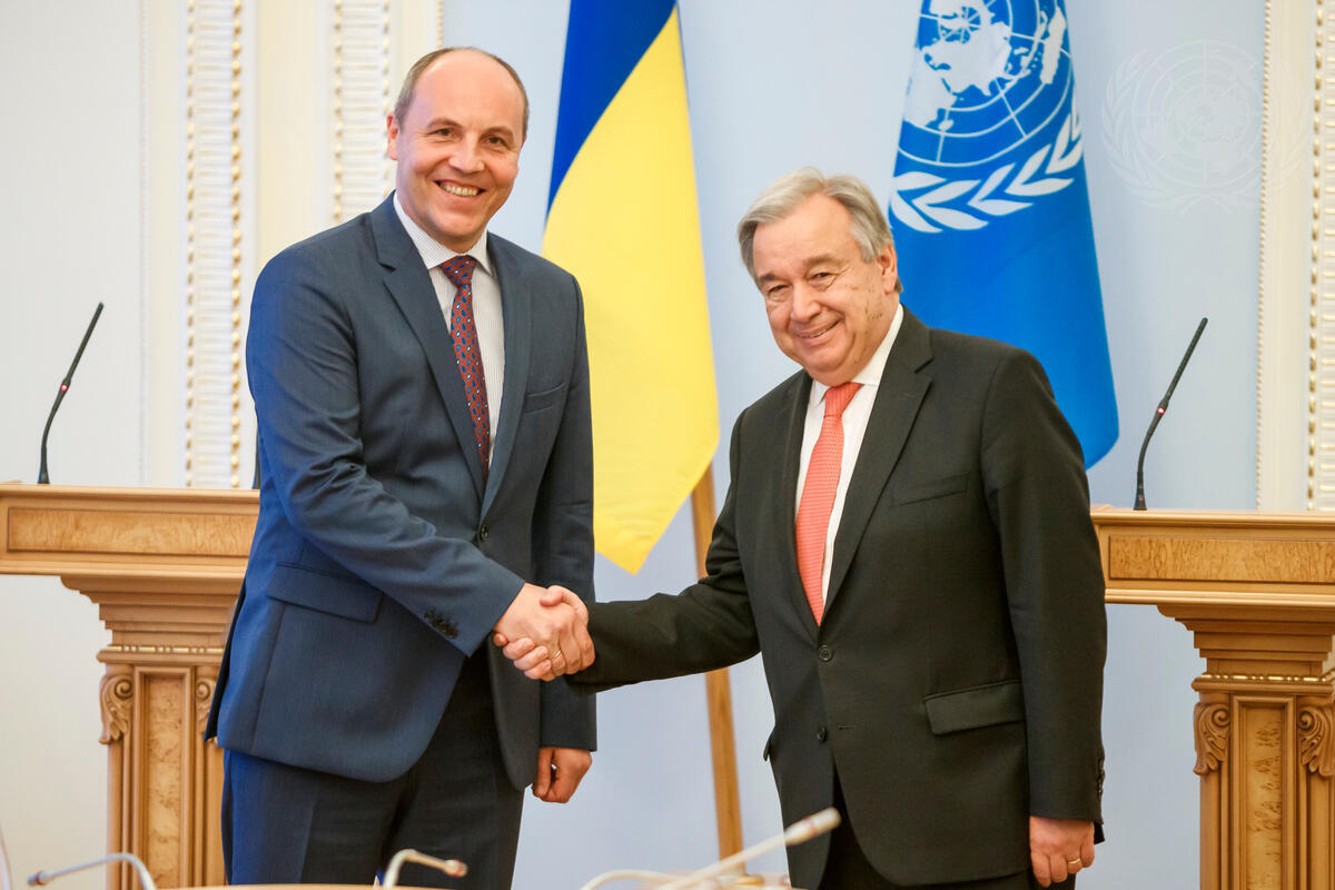 Secretary-General António Guterres (right) meets with Andriy V. Parubiy, Chairman of the Verkhovna Rada (Parliament) of Ukraine.