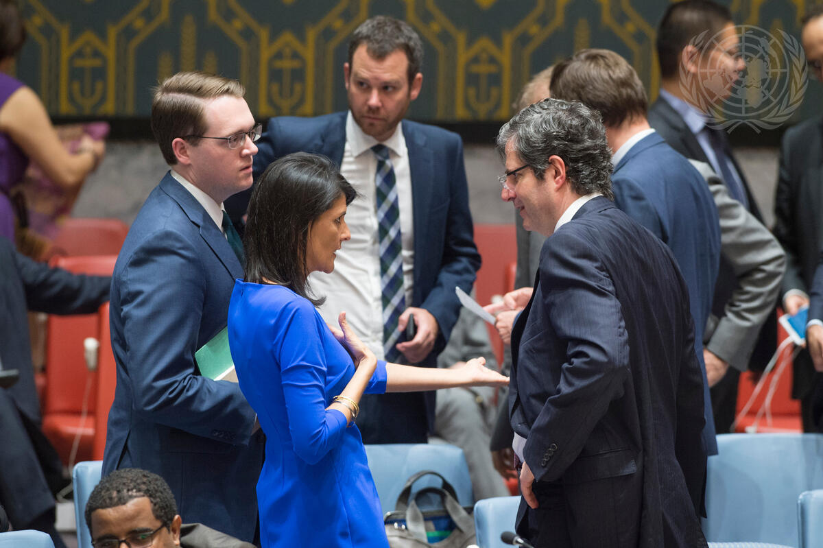 Nikki Haley (centre left), United States Permanent Representative to the UN, speaking with François Delattre, Permanent Representative of France, at the Council meeting.