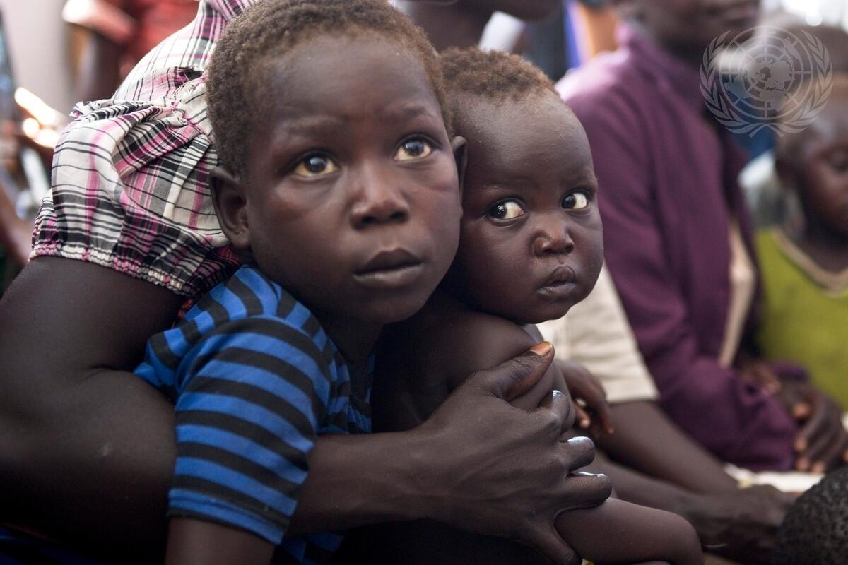 Children listen as the Secretary-General meets with South Sudanese refugees at the Imvepi settlement.