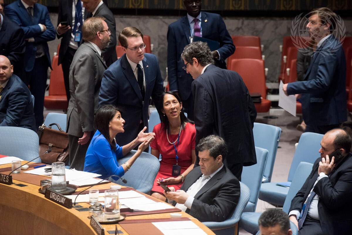 Nikki Haley (seated centre left), United States Permanent Representative to the UN, speaking with François Delattre (centre right, back to camera), Permanent Representative of France, at the meeting. Pictured with them, Michele J. Sison (seated centre), United States Deputy Permanent Representative.